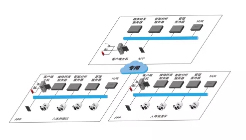 系统支持多级组织架构和分布式部署。按照使用场所、卡口数量、 测温目标数量的不同,可采取不同部署模式。在具体应用中,对于监狱大门、办公楼、监狱医院、监狱超市等出入口,可设置单点式布控,用体温检测设备,对出入人员进行非接触式筛查;对监狱厂房、监舍多个人行通道口或监狱范围内有多个人行出入口的,可设置联网式布控,通过固定点位安装的方式,将多个体温检测装备联网,在 中心实现对监测区域内的全局监测,避免造成交叉感染。