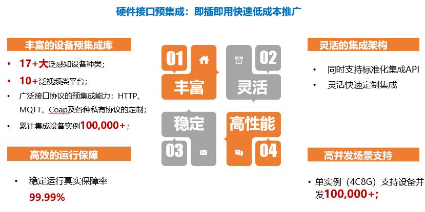 迄今日海已经预集成17+大泛感知设备种类,10+泛视频类平台,广泛接口协议的预集成能力涵盖了HTTP、MQTT、Coap及各种私有协议的定制,累计集成设备实例达100,000+。它还支持标准化集成API,可灵活快速地定制集成,通过构建规则引擎,实现了各设备间的联动应用,比如检测到违规停车,联动广播就会自动播报提醒,为社区管理服务赋能。